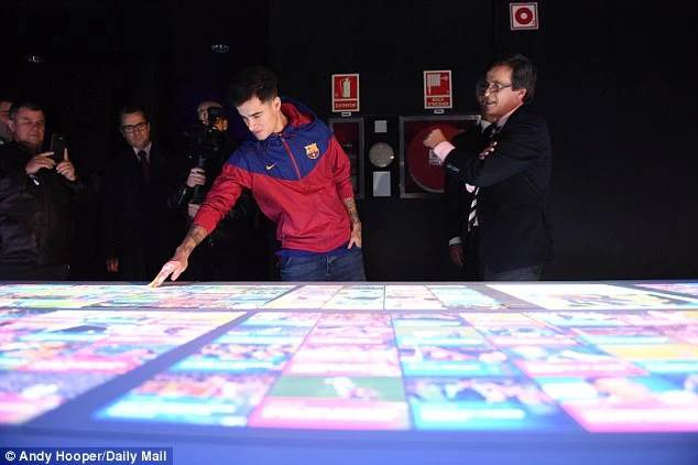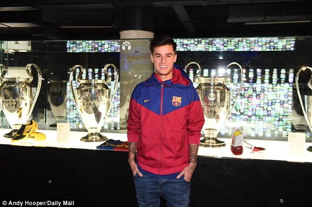 Coutinho ghé thăm phòng truyền thống của CLB và chụp ảnh bên cạnh năm chiếc cúp châu Âu của Barcelona.