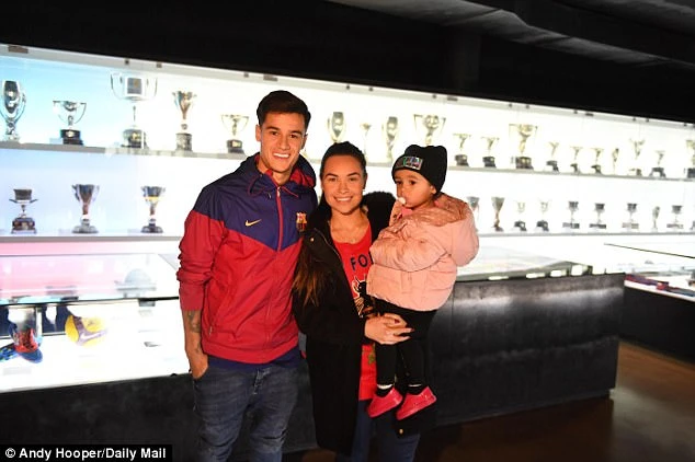 Coutinho cùng vợ Aine và con gái Maria bên tủ trưng bày những chiếc cúp của CLB Barcelona tại Nou Camp.