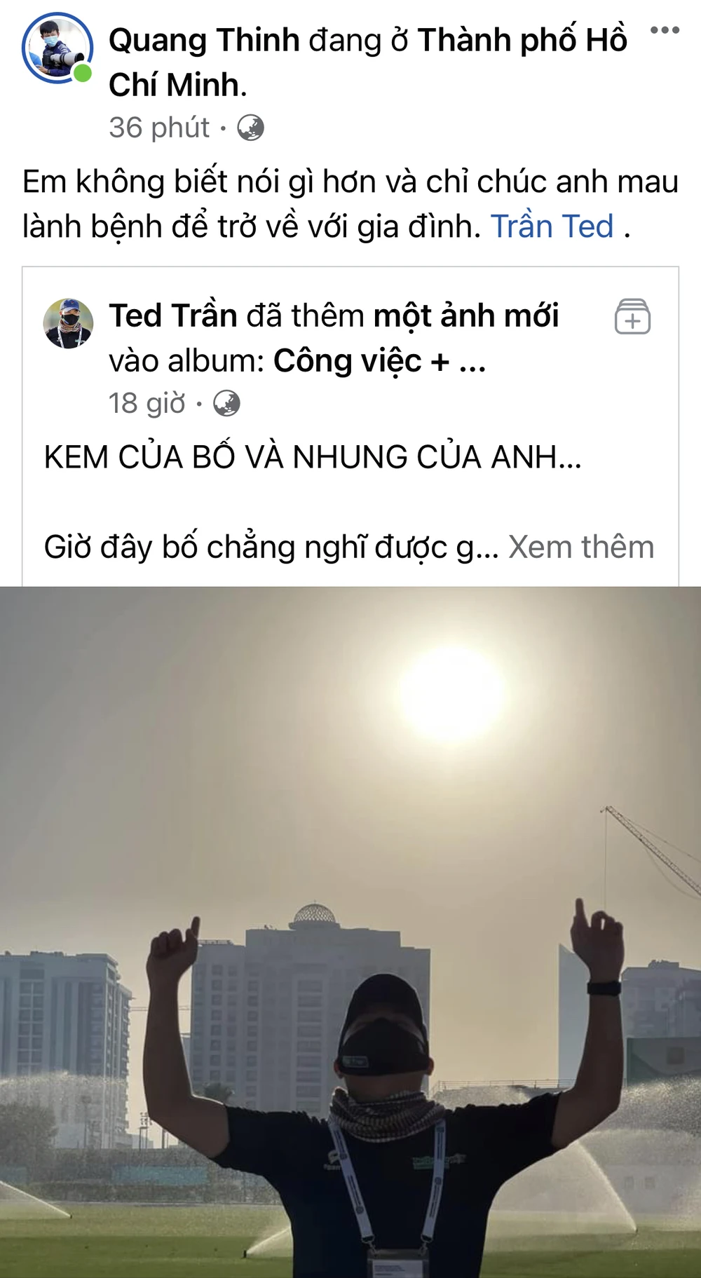 Tôi hiểu, khi biết tin tôi bệnh, anh em đã có những lúc trách móc. Nhưng sau đó, tất cả đều động viên tôi khỏi bệnh. Anh em còn giúp đỡ tôi trong công việc, giúp Ted Trần có những hình và ảnh quý báu. Tôi thật sự xin lỗi vì đã làm ảnh hưởng đến tinh thần của anh em. Và tự đáy lòng, tôi cảm ơn anh em rất rất nhiều. Sau khi khỏi bệnh về nước, tôi nhất định sẽ gặp team Dubai để được cảm ơn anh em.