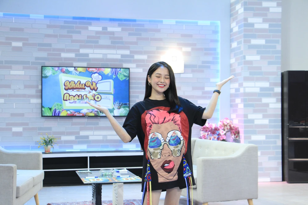 Chính những lời nói ngọt ngào đó khiến cho nữ diễn viên vừa xuất hiện đã lộ rõ dáng vẻ ngại ngùng và nói: “Ở trong cánh gà nghe chị Hà Thu giới thiệu em từ sao nhí giờ trở thành nữ diễn viên xinh đẹp làm em ngại quá trời luôn”.