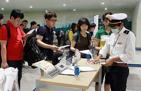 Hành khách từ Hàn Quốc nhập cảnh đến Việt Nam thực hiện kê khai tờ khai y tế tại sân bay Nội Bài. Ảnh: TTXVN