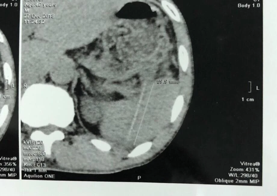 Bệnh nhân kể trước đó bị đau vùng hạ sườn trái suốt hai tuần mà không rõ nguyên nhân nên đến một trung tâm y khoa thăm khám. Tại đây, các bác sĩ phát hiện dị vật có hình dạng một cây tăm nằm trong nhu mô lách. Ngay lập tức, anh được đưa đi cấp cứu tại BV Bình Dân trong ngày.