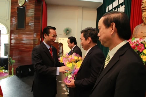 Ông Nguyễn Xuân Anh (tân bí thư Thành ủy Đà Nẵng) trong một dịp tặng hoa cho các bác sĩ ưu tú của TP. Ảnh: LÊ PHI