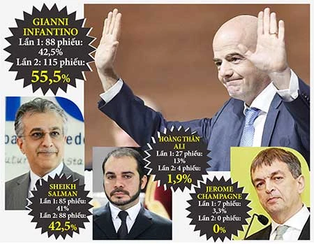 Cuộc bỏ phiếu phải tiến hành sang vòng 2 và lúc đấy thì Gianni Infantino về đích trở thành tân chủ tịch FIFA. Ảnh: GETTY IMAGES. Đồ họa: BB