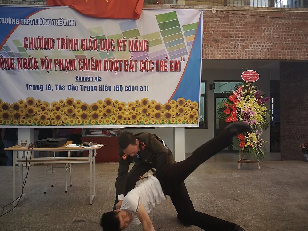 Bộ Công an vừa phối hợp với Trường THPT Lương Thế Vinh (Thanh Trì, Hà Nội) tổ chức thực hành thoát hiểm khi bị bọn buôn người bắt cóc cho học sinh trong trường. Mục đích của buổi thực hành giúp cho các em học sinh có thể nắm được những kỹ năng tự vệ cần thiết để ứng phó khi có tình huống nguy hiểm xảy ra.