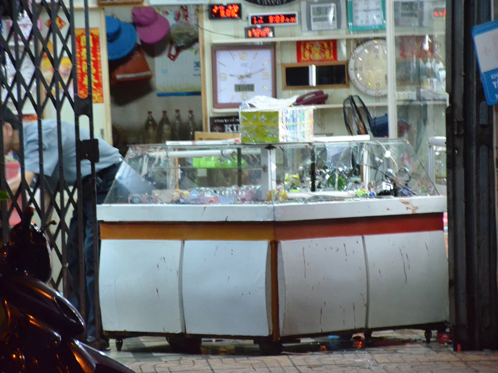 Người này sau khi rượt đuổi một phụ nữ bán vé số thì xông vào cửa hàng bán đồng hồ trên đường, chửi mắng rồi đập vỡ tủ kính.