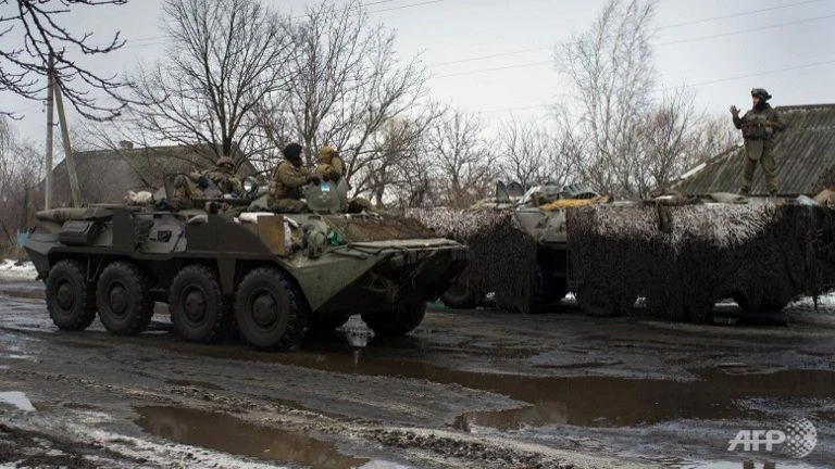 Xe thiết giáp phe Kiev tiến vào làng Orlovka phía Đông thành phố Donetsk ngày 23-1 (Ảnh: AFP)
