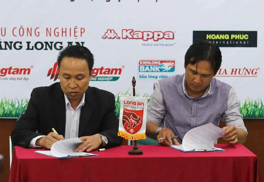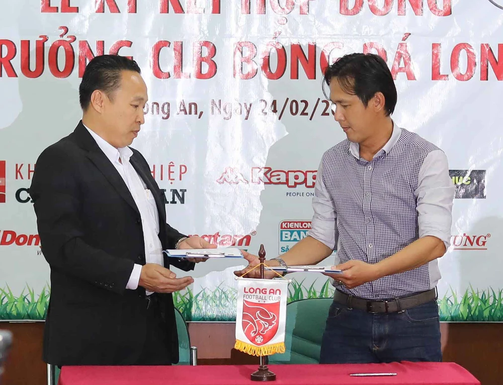 Quyền chủ tịch CLB Long An Nguyễn Môn ký hợp đồng với HLV Minh Phương.