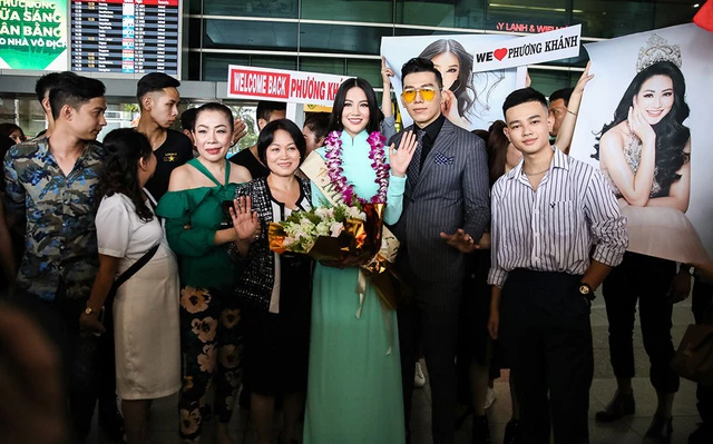 Đón Phương Khánh có đông đảo giới truyền thông, ekip của cô, người thân và nhiều người hâm mộ. Mẹ hoa hậu luôn theo sát con gái và sẵn sàng trả lời phỏng vấn giới truyền thông.