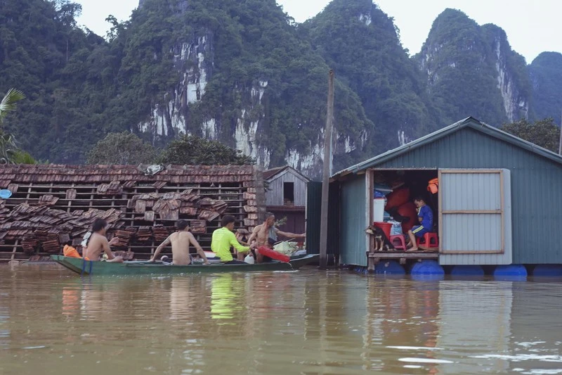 Các lực lượng chức năng đang di chuyển bà con lên sống trên các nhà nổi trên địa bàn xã này