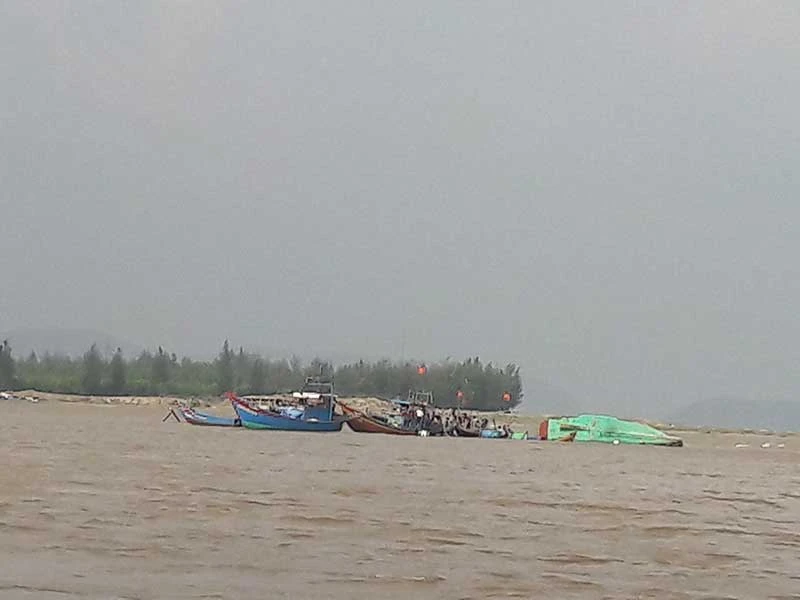 Chiều 16-10, “đội đặc nhiệm” của làng biển Cảnh Dương đã huy động nhiều tàu thuyền, thiết bị ra cửa biển lặn tìm, trục vớt những chiếc tàu bị nước lũ cuốn trôi. Ngay đoạn luồng thông ra cửa biển, lổn nhổn những xác tàu bị sóng đánh chổng ngược, lật úp.
