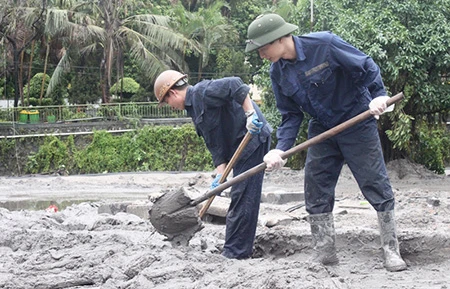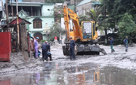 Huy động hàng trăm công nhân khắc phục hậu quả sau lũ. Ảnh: Đ. TRUNG