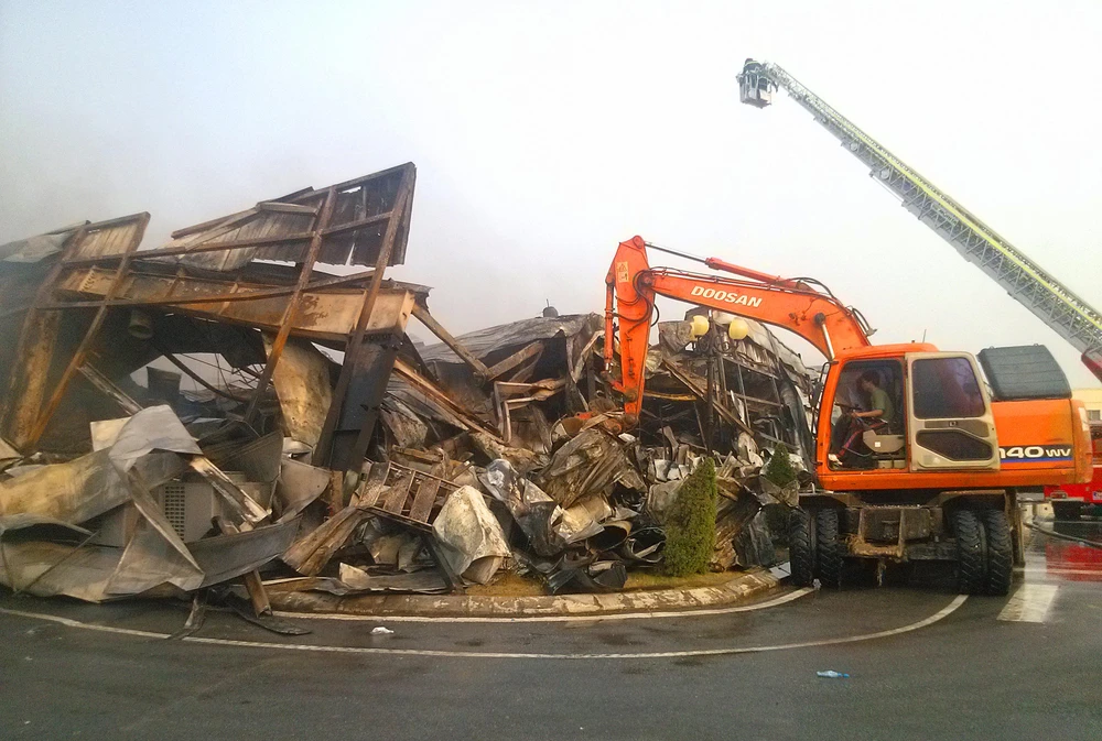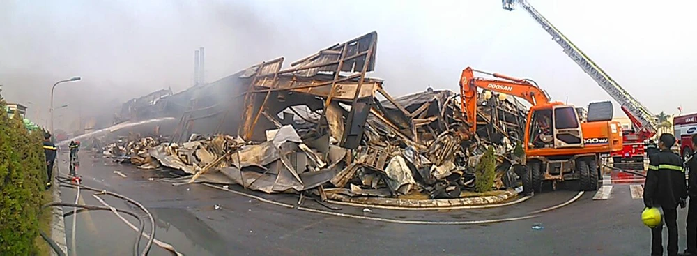 Xe ủi vừa phải ủi sập một phần nhà xưởng để tránh lây lan, vừa thu dọn hiện trường để lực lượng chữa cháy tiếp cận hiện trường.