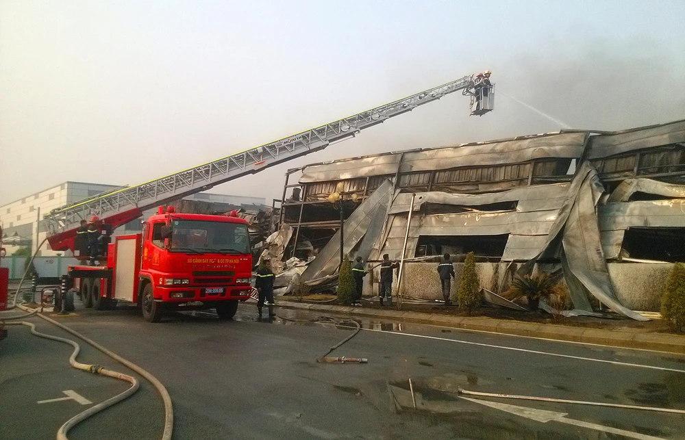 Lực lượng PCCC Hà Nội đã điều xuống 2 xe thang chuyên dụng xuống Bắc Ninh để hỗ trợ việc chữa cháy.