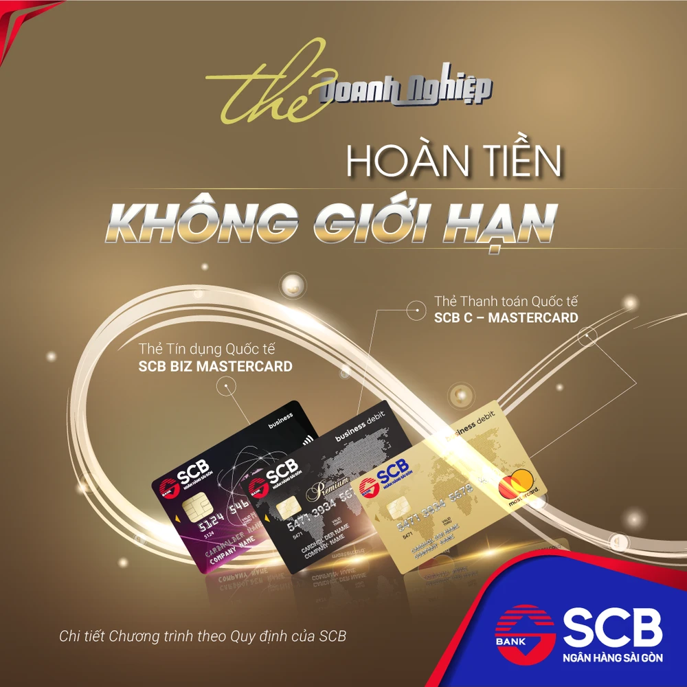 Đồng thời, nhằm khuyến khích hình thức thanh toán không dùng tiền mặt và gia tăng nhiều đặc quyền dành cho khách hàng doanh nghiệp, SCB tung ra chương trình “Thẻ Doanh nghiệp SCB – Hoàn tiền không giới hạn” kéo dài tới 31-12 dành cho thẻ thanh toán quốc tế SCB C-MasterCard và thẻ tín dụng quốc tế SCB Biz Mastercard.