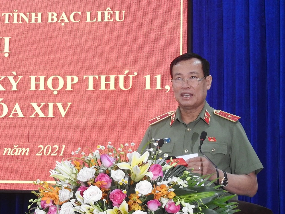 Thứ trưởng Bộ công an Lê Tấn Tới phát biểu trước cử tri Bạc Liêu chiều 9-4 . Ảnh: TRẦN VŨ
