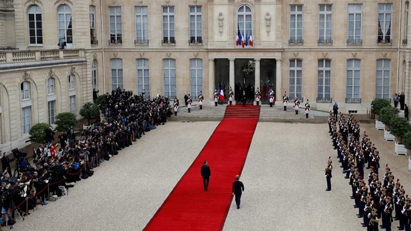 Ông Macron bước đi trên thảm đỏ tại điện Elysee. Ảnh: AFP