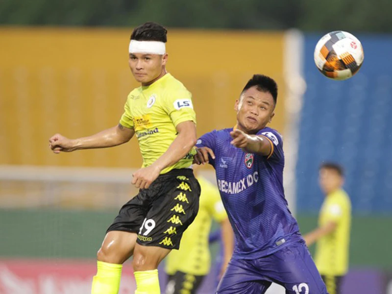 Quang Hải vẫn chưa hết đen khi rách trán trong pha va chạm với Tiến Linh, bù lại đàn anh Văn Quyết chơi cực hay, góp phần tạo quả 11 m và kiến tạo cho Rimario ghi bàn. Ảnh: CTV