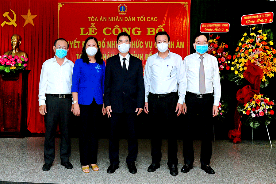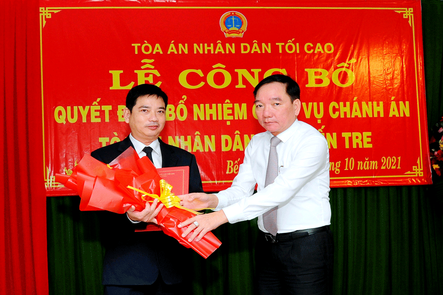 Thay mặt lãnh đạo TAND Tối cao, ông Trần Anh Tuấn - Vụ trưởng Vụ tổ chức, cán bộ TAND Tối cao đã công bố quyết định của Chánh án TAND Tối cao về việc bổ nhiệm ông Bùi Quang Sơn, Phó Chánh án TAND tỉnh Bến Tre, giữ chức vụ Chánh án TAND tỉnh Bến Tre nhiệm kỳ 5 năm kể từ ngày 1-10-2021.