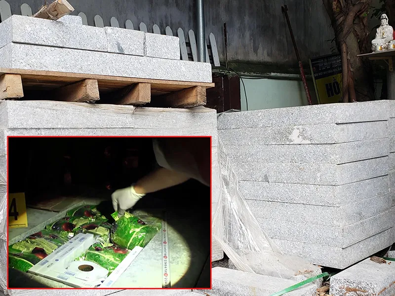 Các thanh đá được xếp thành khối và bên trong được tạo lỗ trống chứa ma túy tại kho ở quận Thủ Đức để chuẩn bị xuất sang Hàn Quốc. Ảnh: Tự Sang - CA