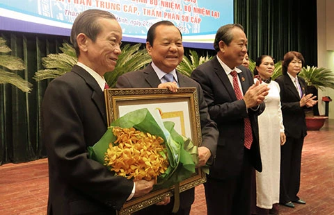 Nguyên Chánh án TAND TP.HCM Bùi Hoàng Danh (trái) nhận huân chương Lao động hạng hai. Ảnh: HOÀNG YẾN
