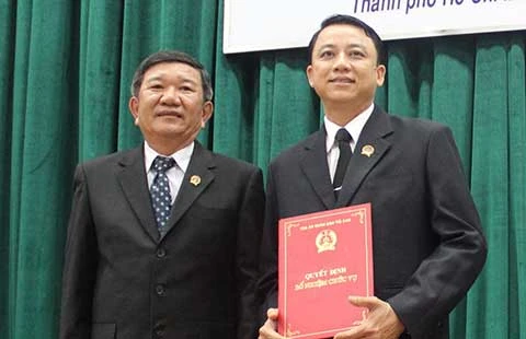 Phó Chánh án TAND TP.HCM Nguyễn Văn Châu (trái) trao quyết định bổ nhiệm cho Thẩm phán Lại Văn Trình. Ảnh: H.YẾN