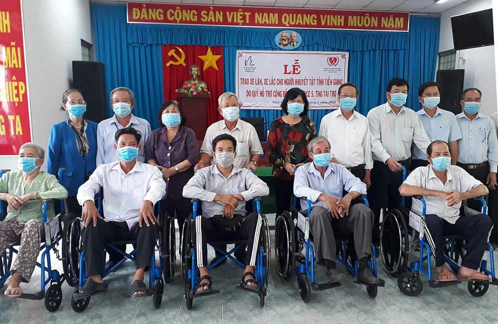 Theo đó, sáng 20-8, Quỹ Lawrence S. Ting cùng Hội Bảo trợ tỉnh Tiền Giang đã trao tặng 100 chiếc xe lăn, 50 chiếc xe lắc tình thương cho người khuyết tật có hoàn cảnh khó khăn tại địa phương.