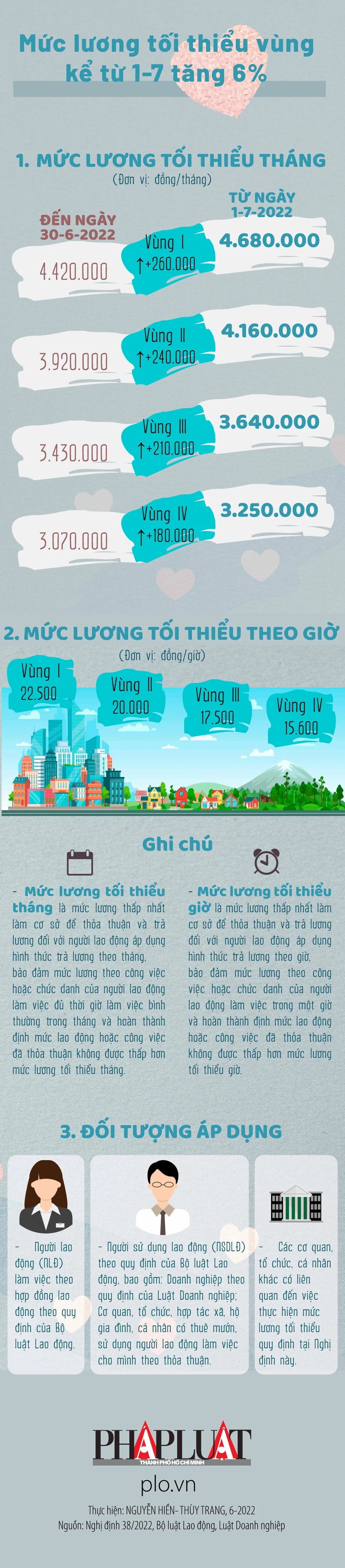 (PLO)-  Nghị định 38/2022 quy định mức lương tối thiểu đối với NLĐ làm việc theo hợp đồng lao động chính thức có hiệu lực từ ngày 1-7. Theo đó, mức lương tối thiểu tháng tăng bình quân 6% so với mức lương tối thiểu hiện hành.