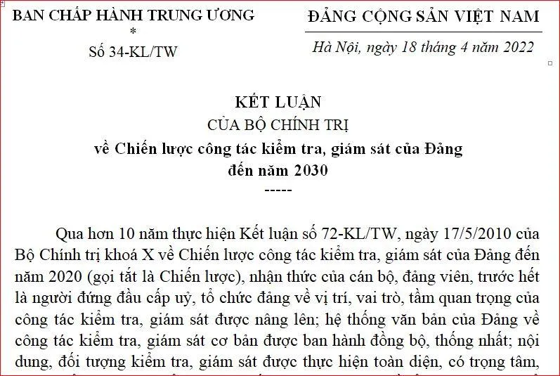 Bộ Chính trị ngày 18-4 đã ban hành Kết luận 34-KL/TW về Chiến lược công tác kiểm tra, giám sát của Đảng đến năm 2030 (gọi tắt là Chiến lược). Điểm mới nhất của Chiến lược này so với Chiến lược cùng tên đến 2020, cũng do Bộ Chính trị ban hành theo Kết luận 72-KL/TW ngày 17-5-2020 là không đóng dấu mật.