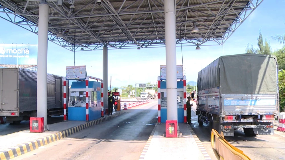 Các phương tiện dừng lại đóng phí ở trạm thu phí Bắc Hải Vân. Ảnh: HẢI HIẾU