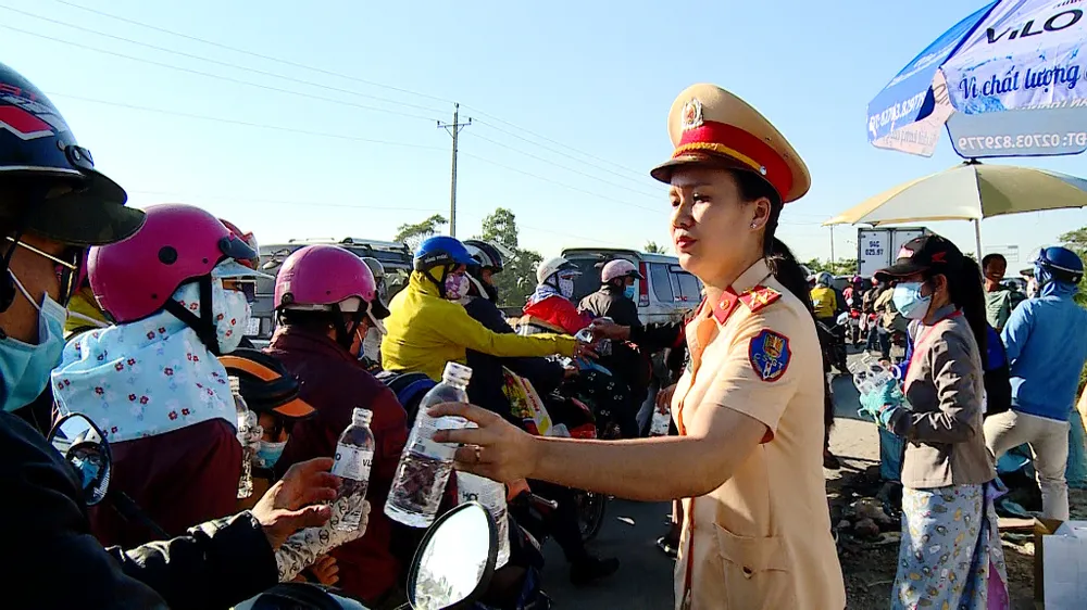 Em Kim Hương (ngụ tỉnh Hậu Giang) cho biết: “Em đang trên đường đi TP.HCM để học mà kẹt ngay chỗ này đâu mua nước được. May có chai nước suối của mấy cô chứ không thôi chết khát quá. Em thấy ấm lòng lắm. Cảm ơn mấy cô nhiều”.