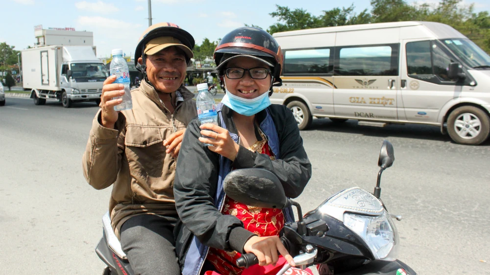 Một người dân quê Cần Thơ vui vẻ cho biết: “Kẹt, nóng bức lắm, may mà có chai nước suối của mấy anh chị cứu khát. Cảm ơn lắm”.