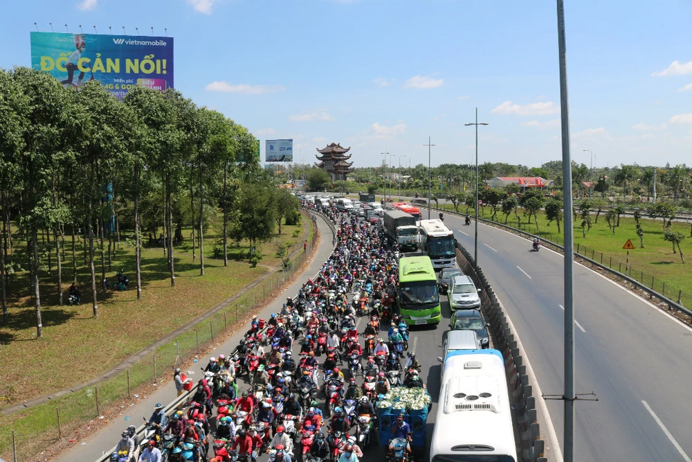 Đến chiều tối 10-2 (mùng 6 Tết) ở các tuyến đường qua TP Vĩnh Long (hướng đi TP.HCM) vẫn trong tình trạng phương tiện ùn ứ kéo dài hàng km.