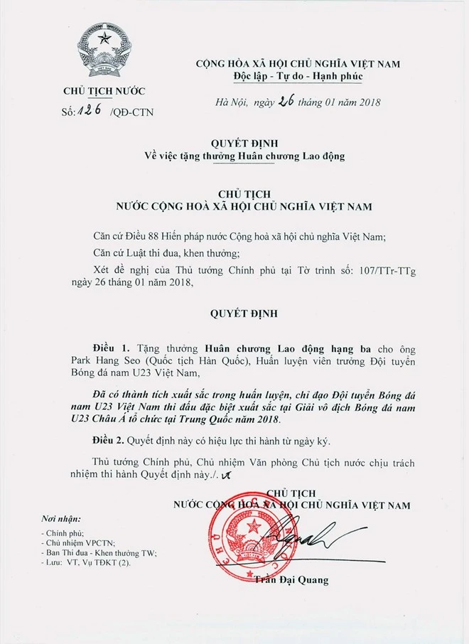 Cùng ngày, Chủ tịch nước Trần Đại Quang đã ký Quyết định số 126/QĐ-CTN, tặng thưởng huân chương Lao động hạng Ba cho huấn luyện viên Park Hang-seo (quốc tịch Hàn Quốc) đã có thành tích xuất sắc trong huấn luyện, chỉ đạo đội tuyển bóng đá U-23 Việt Nam thi đấu đặc biệt xuất sắc.