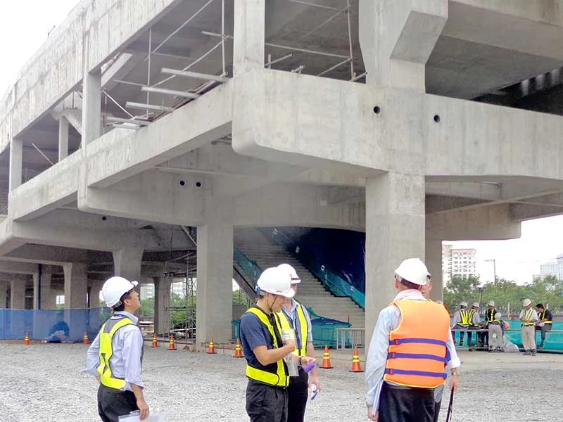 Các chuyên gia đang trao đổi trên nền và trên sàn chờ của nhà ga Thảo Điền của tuyến metro số 1. Ảnh: LĐ