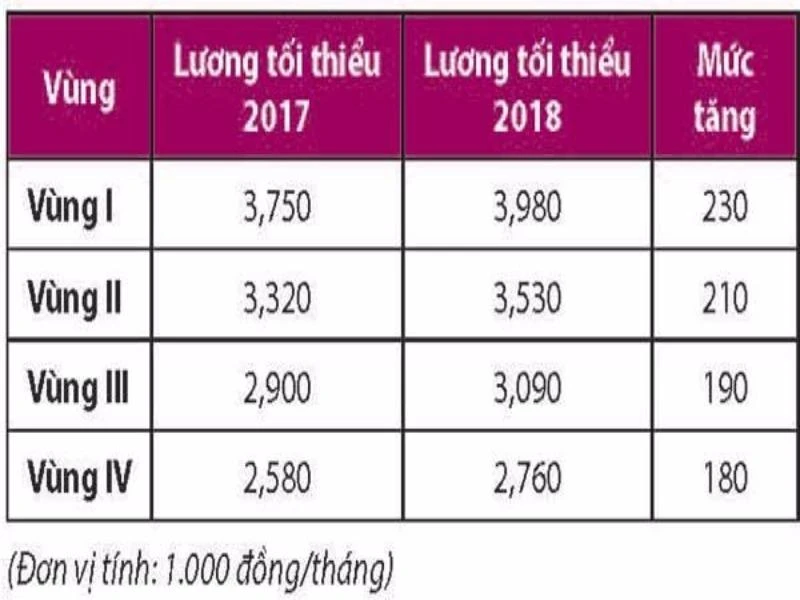 Theo Bộ LĐ-TB&XH, vừa qua Hội đồng Tiền lương Quốc gia đã đề xuất mức tăng lương tối thiểu vùng năm 2018 từ 180.000 đến 230.000 đồng so với năm 2017 (mức bình quân tăng 6,5%) được tính toán dựa trên cơ sở bù đủ trượt giá sinh hoạt năm 2017 dự kiến khoảng 4%-4,5% để bảo đảm tiền lương thực tế cho NLĐ.