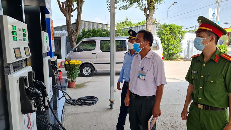 Lực lượng chức năng tỉnh An Giang đồng loạt kiểm tra các cửa hàng xăng dầu trên địa bàn tỉnh. ẢNH: N.HỒ