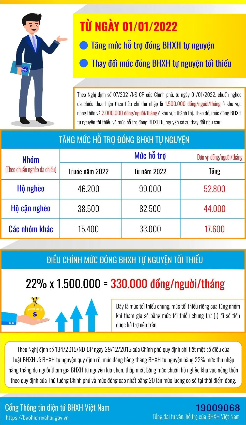 Mức đóng BHXH tự nguyện thấp nhất là: 22% x 1.500.000 đồng = 330.000 đồng/tháng. Tăng 176.000 đồng/tháng so với mức đóng BHXH tự nguyện của năm 2021 (chuẩn hộ nghèo của khu vực nông thôn tại thời điểm này là 700.000 đồng).