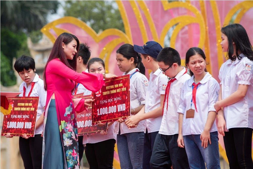 Đại diện Ban tổ chức trao học bổng cho trẻ em khuyết tật trường THCS Xã Đàn, Hà Nội.