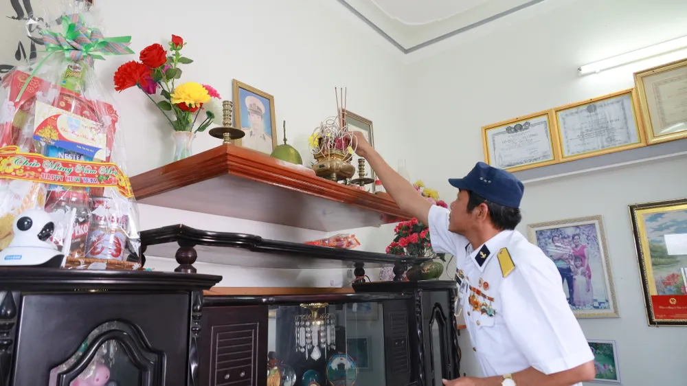 Thương binh Nguyễn Văn Dũng dâng hương tại bàn thờ Anh hùng, liệt sĩ Trần Văn Phương. Ảnh: C.T