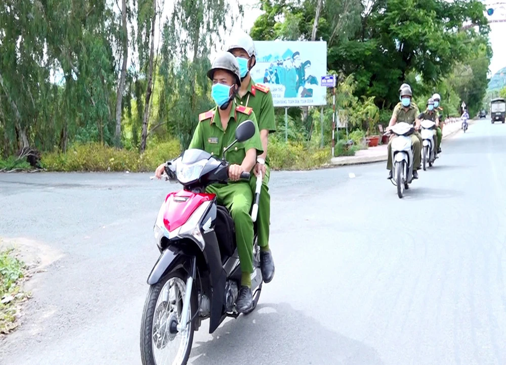 Công an xã Nhơn Hưng (Tịnh Biên, An Giang) tuần tra đảm bảo an ninh trật tự trên địa bàn xã. Ảnh minh họa: TTXVN