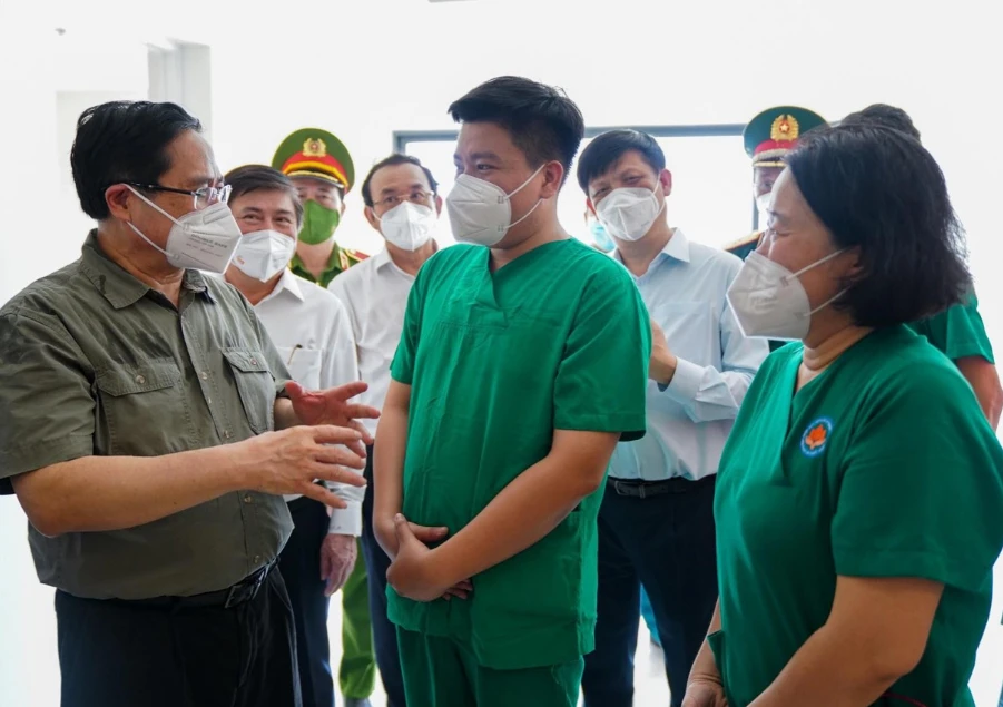 Thủ tướng Phạm Minh Chính thăm hỏi bác sĩ trẻ đang công tác tại bệnh viện dã chiến COVID-19. Ảnh: TRẦN NGỌC