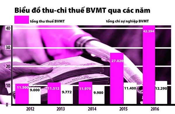 Biểu đồ thu chi thuế bảo vệ môi trường qua các năm. Theo báo cáo của Bộ Tài chính. Đồ họa: HỒ TRANG