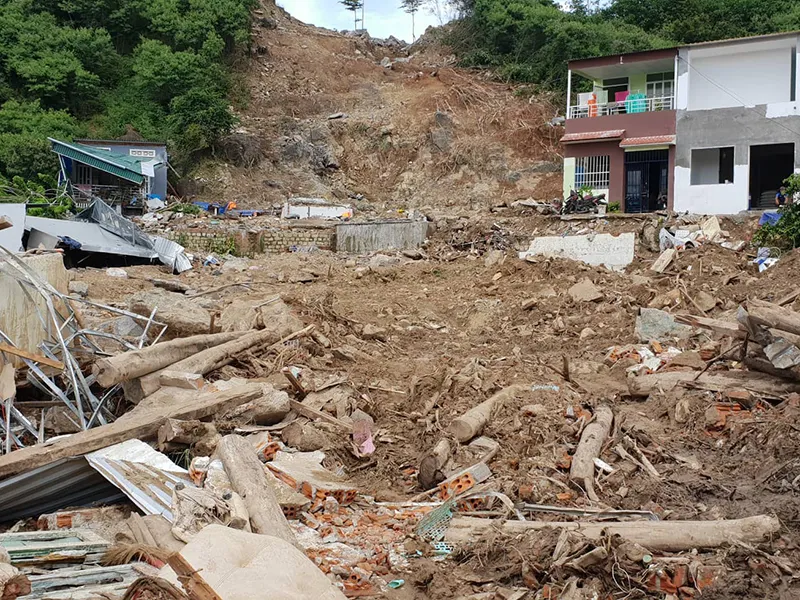 Hơn 10 căn nhà dưới chân núi ở tổ dân phố Hòa Tây, phường Vĩnh Hòa, TP Nha Trang (Khánh Hòa) đã bị nước phá hủy, san bằng hoàn toàn.