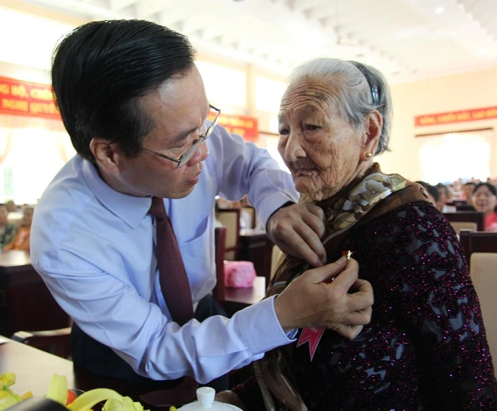 Phó Bí thư Thường trực Thành ủy TP.HCM Võ Văn Thưởng trao tặng danh hiệu vinh dự nhà nước Bà mẹ VN anh hùng cho bà Võ Thị Dấm (ngụ xã Trung An, huyện Củ Chi) - Ảnh: HOÀNG GIANG
