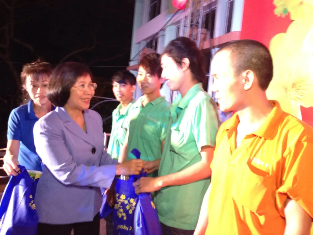 Bà Nguyễn Thị Thu Hà, Phó Bí thư Thành ủy TP.HCM trao vé xe và quà Tết cho công nhân, tối 5-2 - Ảnh: P.ĐIỀN