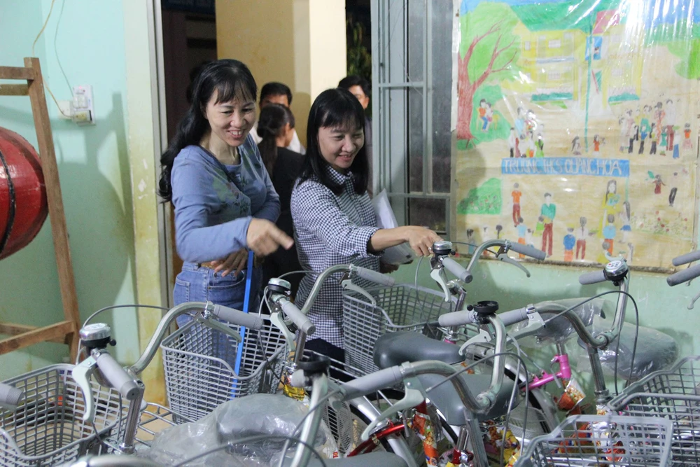 Hai cô Phó hiệu trưởng trường THPT Trưng Vương, cô Lương Bích Nga và cô Lê Tường Quyên chuẩn bị trao 25 xe đạp cho đại diện nhà trường THCS Quảng Hòa. Ảnh: Hoàng Giang