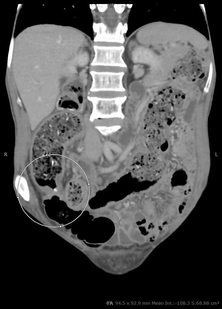 Hình chụp CT cho thấy người bệnh có khối u đại tràng trái. Ảnh: BVCC