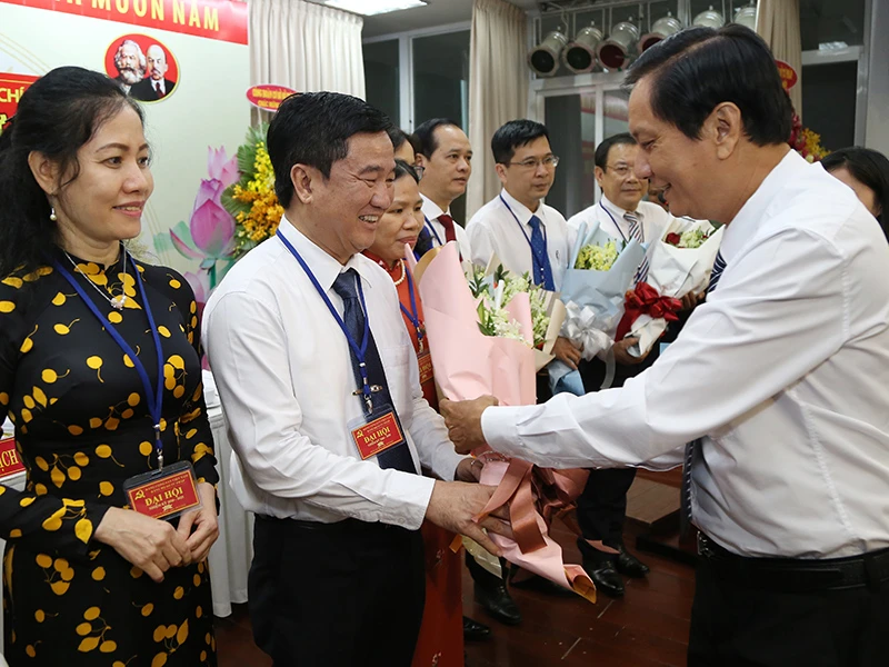 Ông Vũ Hữu Minh, Phó Bí thư Đảng ủy Khối Dân - Chính - Đảng TP.HCM, tặng hoa chúc mừng ông Huỳnh Văn Hạnh và Ban chấp hành Đảng bộ Sở Tư pháp khóa IX, nhiệm kỳ 2020-2025. Ảnh: HOÀNG GIANG