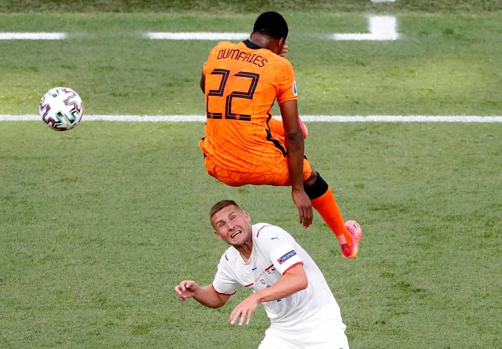 Dumfries có cơ hội dứt điểm đầu trận, nhưng hậu vệ của Czech đã cản phá thành công. Ảnh: Reuters.